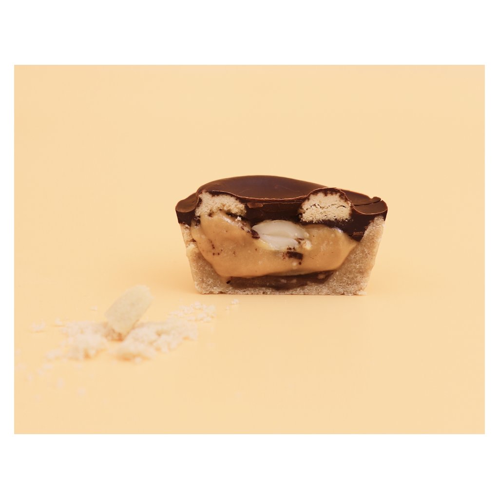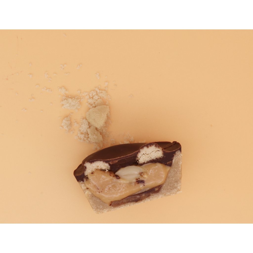 kombinace krému, karamelu a sušenky, doplněná celým arašídem. Dokonalá souhra textur a chutí, která neobsahuje lepek, laktózu ani rafinovaný cukr.